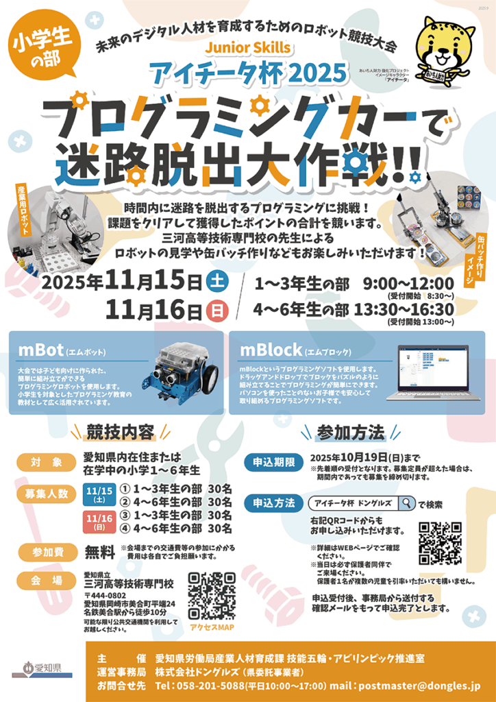 愛知県では、デジタル技術への興味を深めてもらうとともに、将来のデジタル利活用人材の育成につなげるため、小・中学生を対象にしたロボットの競技大会「Junior Skills『アイチータ杯2025』」を開催します。