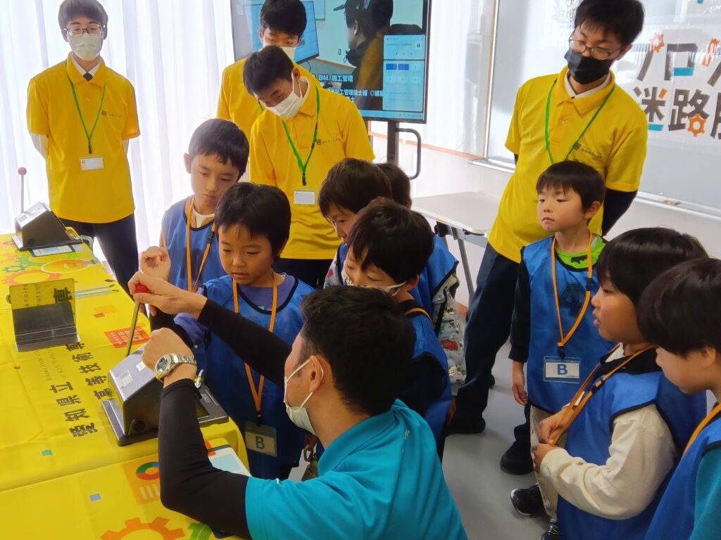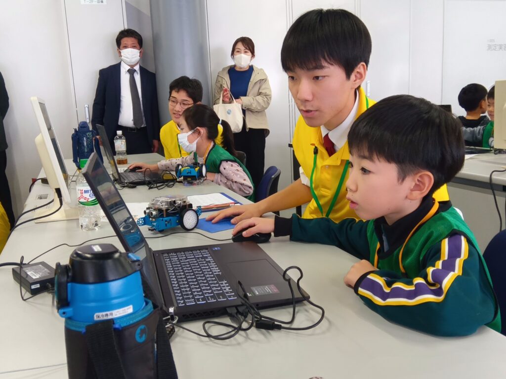 イベント当日には、愛知県立岡崎工科高等学校情報デザイン科の生徒さんが小中学生のサポート役を務め、高校の紹介や若年者ものづくり競技大会で使用したロボットの披露などをしていただきました。