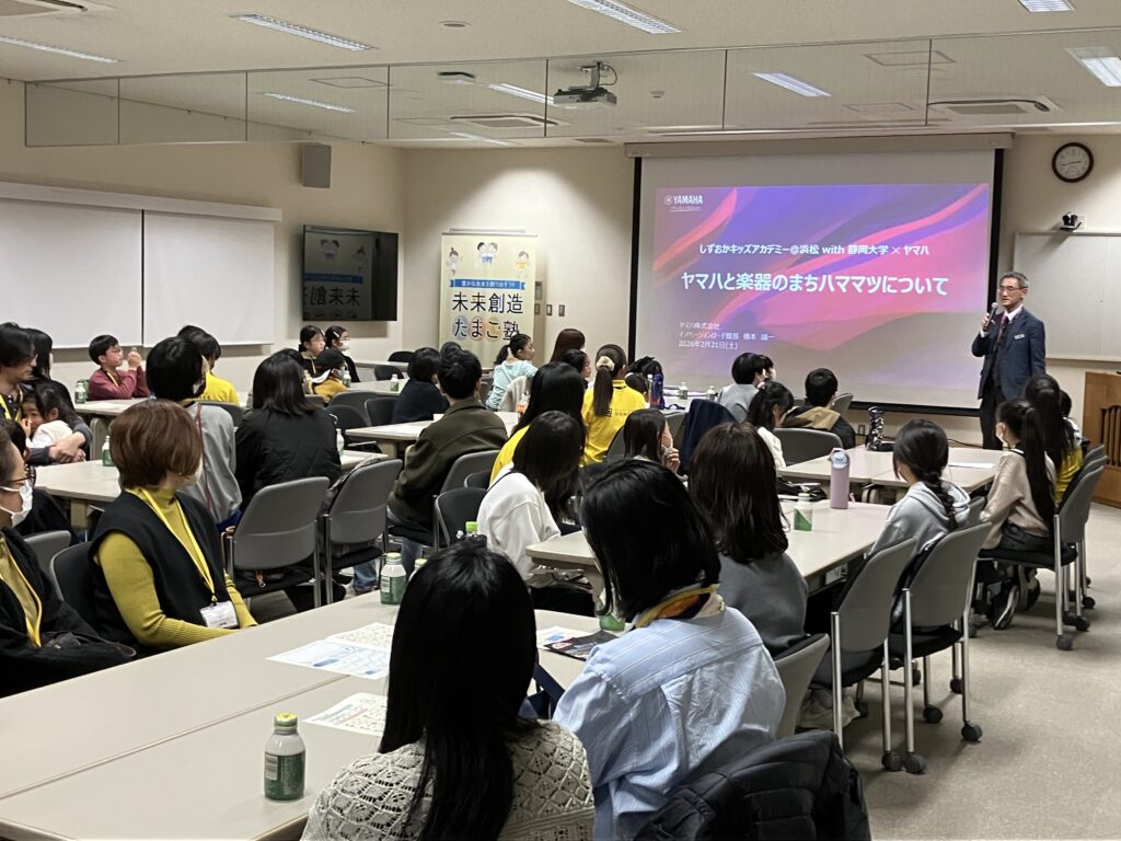 イベント後半では、ヤマハ株式会社様より、楽器のまち浜松を代表する企業であるヤマハの歴史や取り組みについてご講演いただきました。さらに、ヤマハ企業ミュージアム「イノベーションロード」の見学ツアーが行われ、参加した子どもたちは、楽器づくりや音・技術に関する展示を通して、企業のものづくりの歴史と挑戦について理解を深めました。